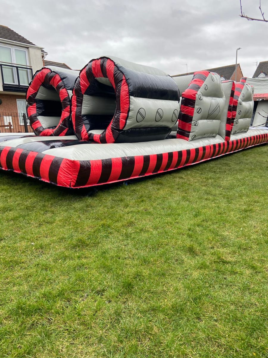 Don't miss out on the excitement! Book our 60ft Red and Grey Assault Course today and get ready to embark on an unforgettable adventure. Whether it's for a birthday party, a corporate event, or a community gathering, this course will bring joy and excitement to all participants.